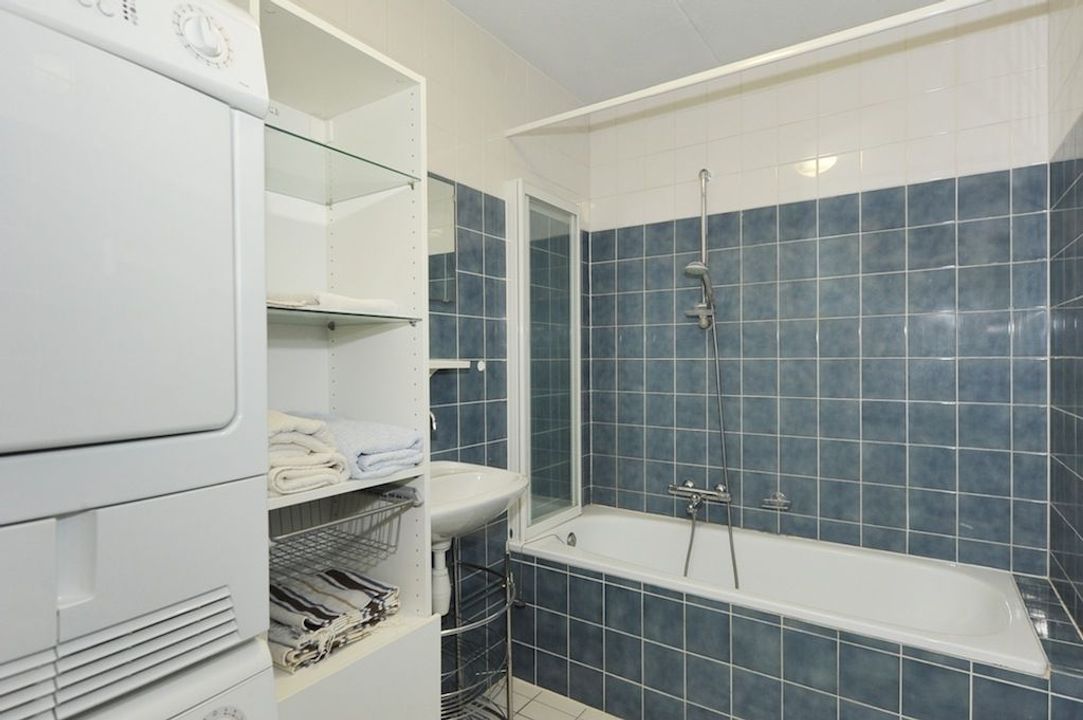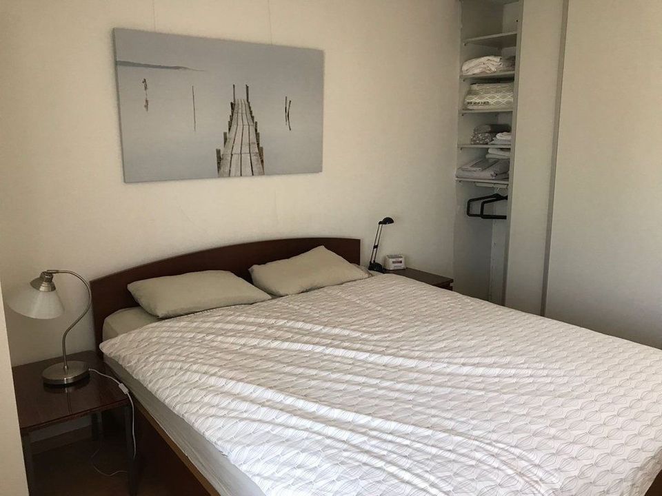 The apartment is accessible by elevator and has 2 bedrooms. The master bedroom has a double bed with fixed wardrobe, the smaller bedroom is equipped with a desk and chair.